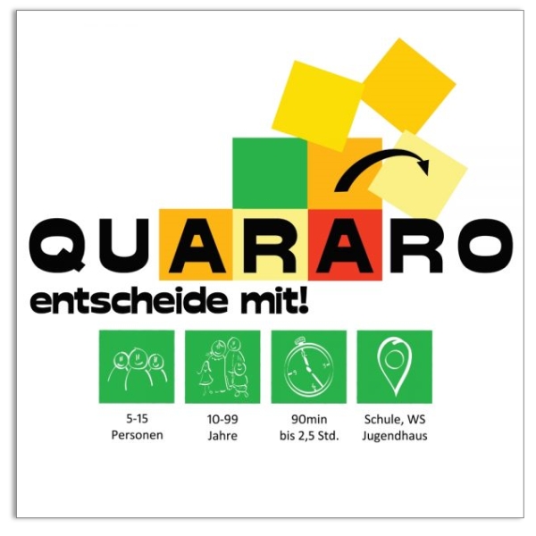 Material: Wir bringen mit: Spielmaterial QUARARO, Moderationsmaterial, Arbeitskarten